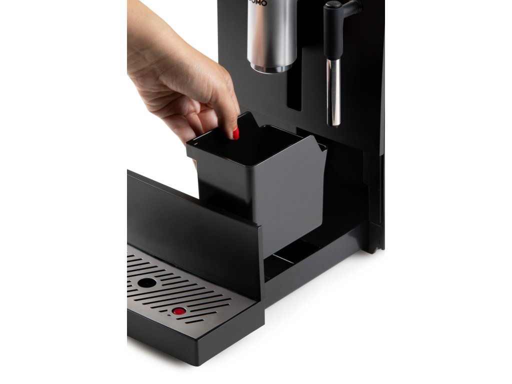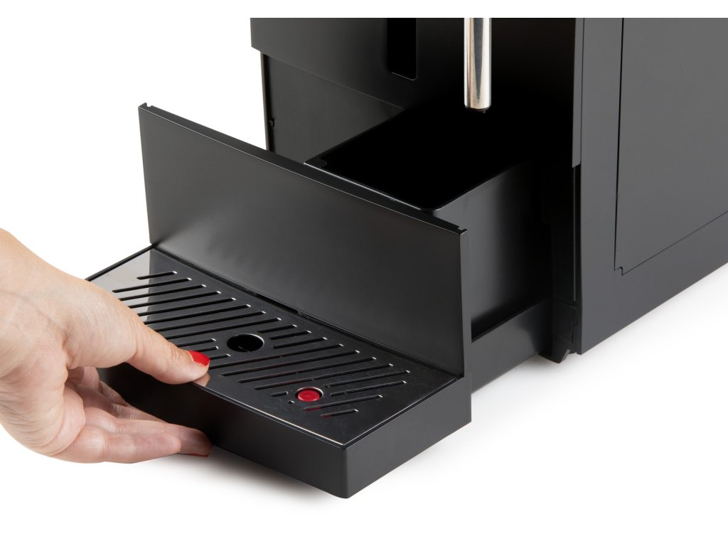 - Snadno odnímatelný zásobník na kávové sedliny včetně odkapávací misky s nerezovou krytkou