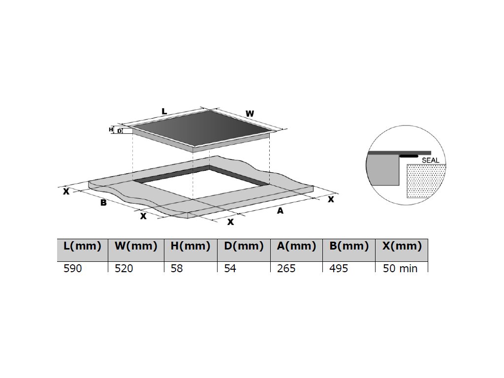 Indukční varná deska šířky 60 cm; Povrch z černého skla s s rovnými hranami; Ovládání pomocí otočných voličů; 8 stupňů nastavení výkonu; 4 nezávislé varné zóny: levá přední 18 cm / 2,0 kW, levá zadní 16 cm / 1,5 kW, pravá přední 16 cm / 1,5 kW, pravá zadní 18 cm / 2,0 kW; Celkový příkon 7,0 kW; Detekce nádobí; Automatická ochrana vypnutím; Indikace zbytkového tepla; Časovač pro automatické vypnutí, nebo pro použití jako minutka; Rozměry (VxŠxH): 58 x 59 x 52 cm