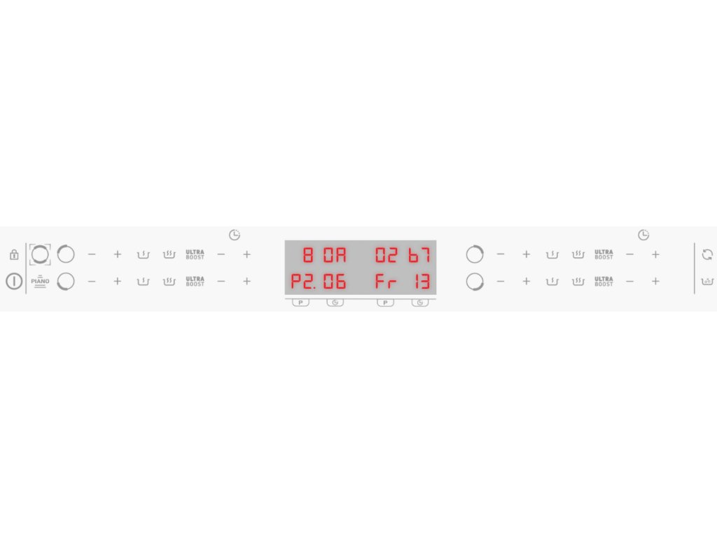 Indukční varná deska 60 cm široká řady Ultra Boost s variabilní plochou horiZone s funkcí Piano; povrch z bílého skla; rovné hrany; možnost zapuštění do pracovní desky; dotykové ovládání Intellect Expert; 15 stupňů nastavení výkonu; 4 varné zóny: levá variabilní varná plocha horiZone s funkcí Piano 40 x 23 cm (4000 W), 21 cm (3600 W), 16 cm (2500 W); Funkce Ultra Boost pro okamžitý přístup k maximálnímu výkonu pro všechny varné zóny; Nezávislý časovač 1-99 min. pro všechny varné zóny; Funkce horiZone Piano, Tempo, Boil, Recall a Clean Lock; celkový příkon 7400 W; 10 bezpečnostních prvků