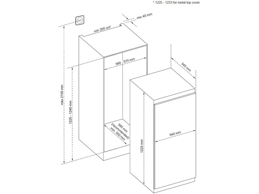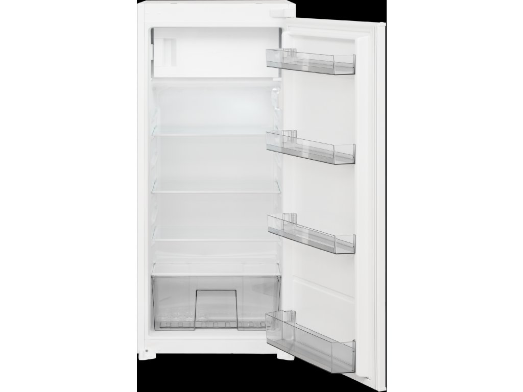 Vestavná chladnička s mrazícím oddílem nahoře; Celkový objem 178 l; Elektronická regulace teploty; Možnost změny směru otevírání dveří; Lišty pro vestavbu; En. třída E; Spotřeba el. energie: 149 kWh/rok; Hlučnost 38 dB; Klimatická třída N; Rozměry (VxŠxH): 122,5 x 54 x 54,5 cm