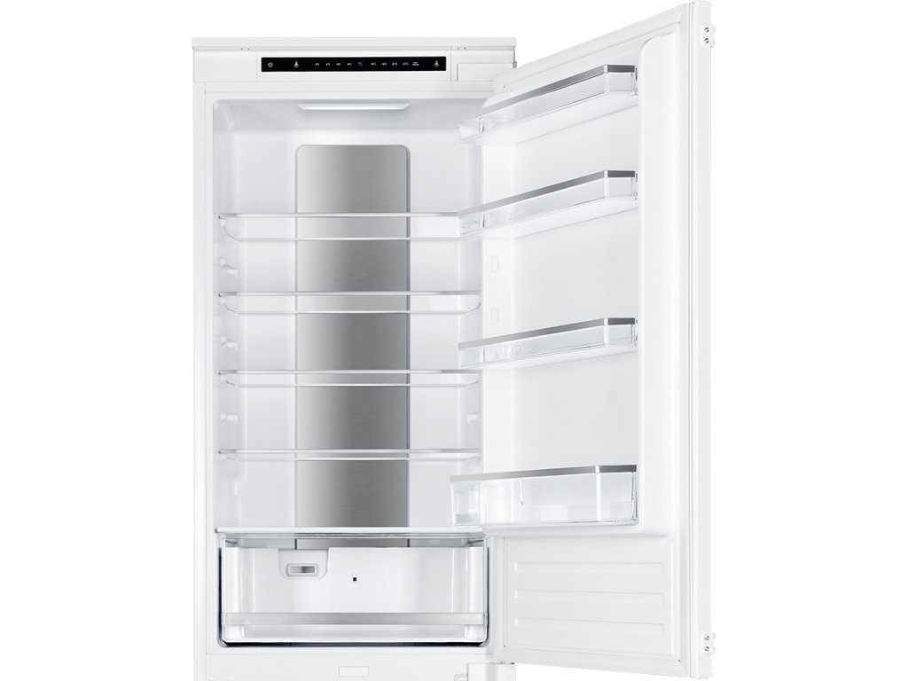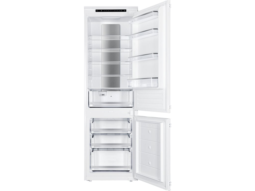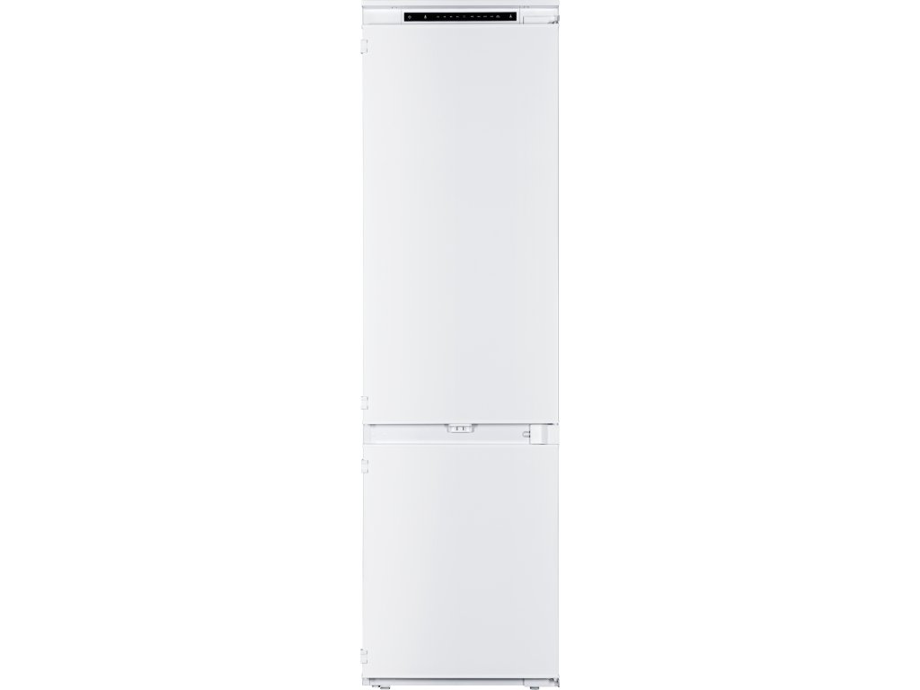 Kombinovaná vestavná chladnička s mrazákem dole; Systém Total No Frost; Bílé barevné provedení; Metal Cooling v barvě nerez; Celkový užitný objem: 270 l; Vnitřní LED osvětlení; Bíle podsvícené ovládací prvky; Způsob instalace nábytkových dvířek: Posuvné lišty; Možnost změny směru otevírání dveří; Invertorový kompresor; Klimatická třída SN, N, T; Energetická třída D; Roční spotřeba energie: 182 kWh; Hlučnost pouhých 37 dB(A); Délka přívodního kabelu 220 cm; Hmotnost: 56 kg; Rozměry (VxŠxH): 193,7 x 54 x 55 cm