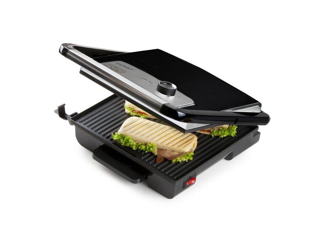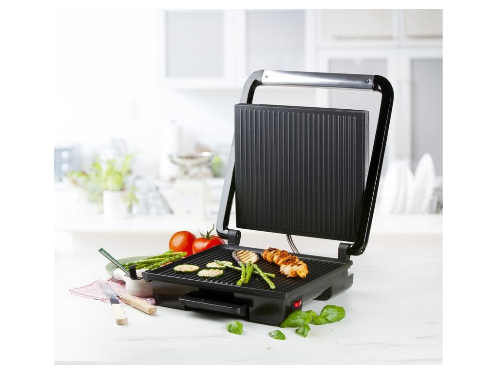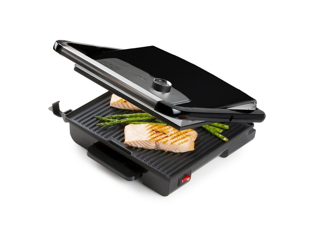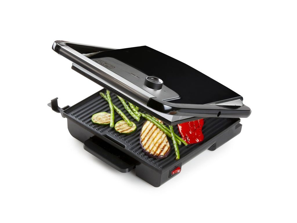 Elektrický kontaktní gril v provedení panini s plovoucí horní deskou vám pomůže zapéct panini i plněné sendviče, ugrilovat ryby, nebo zeleninu a připravit perfektní steaky a jiné maso. Nepřilnavý povrch pečících desek nevyžaduje ani použití tuku, či oleje na smažení a i údržba takového povrchu se stává jednodušší. Nadbytečný tuk a šťáva vypečená z masa odtéká otvorem ve spodní grilovací desce do vyjímatelné nádobky. Rychlost a stupeň propečení si můžete jednoduše regulovat pomocí plynule nastavitelného termostatu. Abyste se nepopálili, je gril vybavený tepelně izolovanou rukojetí i tepelně odizolovaným víkem. Aby gril při uskladnění nezabral zbytečně příliš mnoho místa, lze jej snadno postavit díky zámku víka i na výšku.