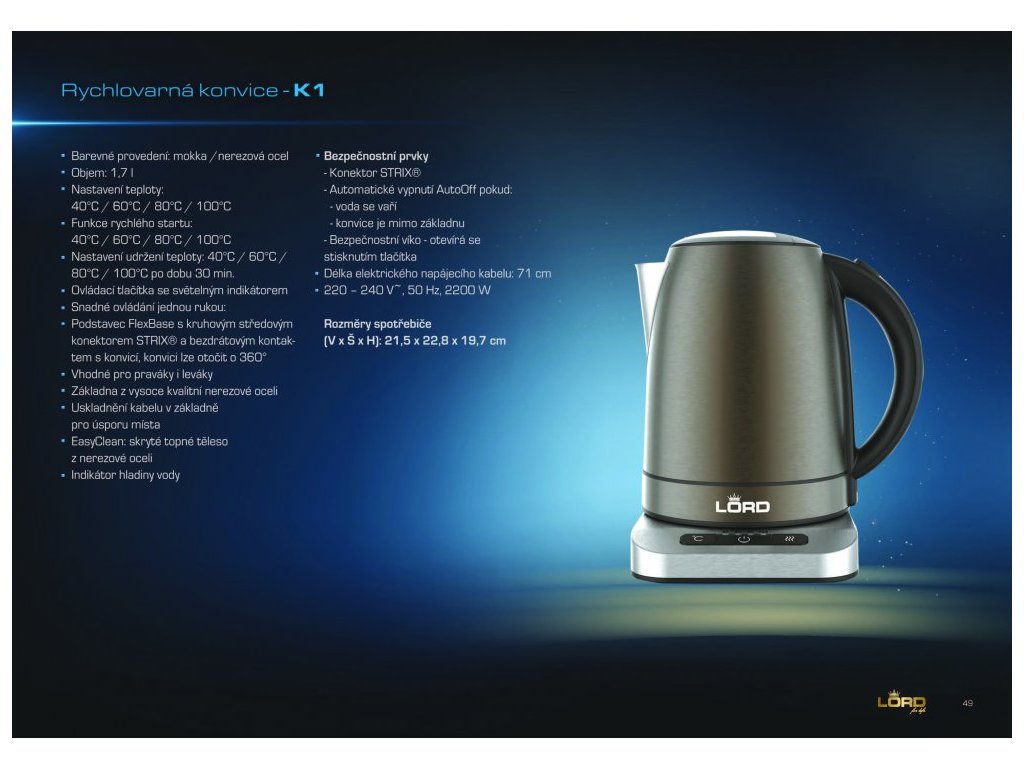 Rychlovarná konvice LORD K1 Rychlovarná konvice LORD K1 v barvě mokka disponuje nastavením teploty vody dle připravovaného nápoje, díky kterému můžete precizně připravit jakýkoliv nápoj pomocí správně teploty. Pro maximální komfort užívání disponuje konvice funkcí Keep Warm pro udržení nastavené teploty až pod dobu 30 minut. Praktičnost konvice podtrhuje tlumené otevírání víka, automatické vypnutí a ochrana proti přehřátí při zapnutí bez vody. Elegance designu rychlovarné konvice K1 je zaručena díky kvalitě použitých materiálů a dokonalému zpracování každého detailu. Rychlovarná konvice K1 se hodí do snídaňového setu k překapávači kávy N1 a topinkovači P1 a to vše v barvě mokka. Důležité informace Objem: 1,7 lNastavení teploty: 40°C / 60°C / 80°C / 100°CFunkce rychlého startu: 40°C / 60°C / 80°C / 100°CNastavení udržení teploty: 40°C / 60°C / 80°C po dobu 30 min. Snadné ovládání jednou rukou:Podstavec FlexBase s kruhovým středovým konektorem STRIX® a bezdrátovým kontaktem s konvicí, konvici lze otočit o 360°Vhodné pro praváky i levákyZákladna z vysoce kvalitní nerezové oceliUskladnění kabelu v základně pro úsporu místaEasyClean: skryté topné těleso z nerezové oceliIndikátor hladiny vody Bezpečnostní prvky Konektor STRIX®Bezpečnostní sklo – vysoká kvalita a tepelná odolnostAutomatické vypnutí AutoOff pokud: voda se vaří konvice je mimo základnu Bezpečnostní víko - otevírá se stisknutím tlačítka Design Barevné provedení: mokka / nerezová ocelOvládací tlačítka se světelným indikátoremDélka elektrického napájecího kabelu: 71 cm220 – 240 V~, 50 Hz, 2000 – 2400 W 5 let záruka zdarma Na všechny spotřebiče značky Lord je v České republice poskytována záruka 5 let zdarma. Prodloužená záruka je uvedena přímo na záručním listu a není potřeba žádná dodatečná registrace.Doplňkové parametry