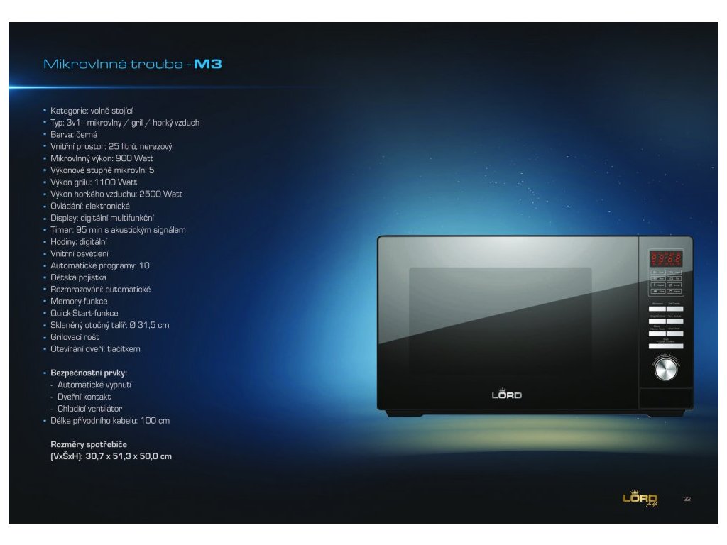 Mikrovlnná trouba LORD M3 Vyzkoušejte multifunkční mikrovlnnou troubu LORD M3 o objemu 25 l s kombinací mikrovln, grilu a horkého vzduchu. Otočný skleněný talíř o průměru 31,5 cm nabízí dostatek místa a 10 automatických programů a dostanete více, než jen ohřev. Digitální časovač se signálem konce ohřevu nebo rozmrazování, které nastavíte podle hmotnosti nebo času, vás upozorní, že pokrm je hotov. Stylový černý design spotřebiče doplňuje nerez vnitřní povrch. Přední strana je osazena ovládacím panelem s digitálním displejem a otočným voličem. Výkon mikrovlnného ohřevu je solidních 900 W a v případě grilu až 1 100 W a všestranné pečení pokrmů horkým vzduchem při výkonu až 2500 W. Produkce v největší továrně na světě s vývojem prvotřídních výrobků, nejmodernější high-tech výrobou a nejvyššími požadavky po zajištění kvality a sociální odpovědnosti jsou místem narození našich mikrovlnných trub. Důležité informace Funkce 3v1 - mikrovlny / gril / horký vzduchZpůsob umístění: volně stojícíBarva: černé skloOvládání: elektronickéDisplej: digitální multifunkčníTimer: 95 min s akustickým signálemVnitřní prostor: 25 litrůVýkonové stupně mikrovln: 5Skleněný otočný talíř: O 31,5 cm 5 let záruka zdarma Na všechny spotřebiče značky Lord je v České republice poskytována záruka 5 let zdarma. Prodloužená záruka je uvedena přímo na záručním listu a není potřeba žádná dodatečná registrace.Doplňkové parametry