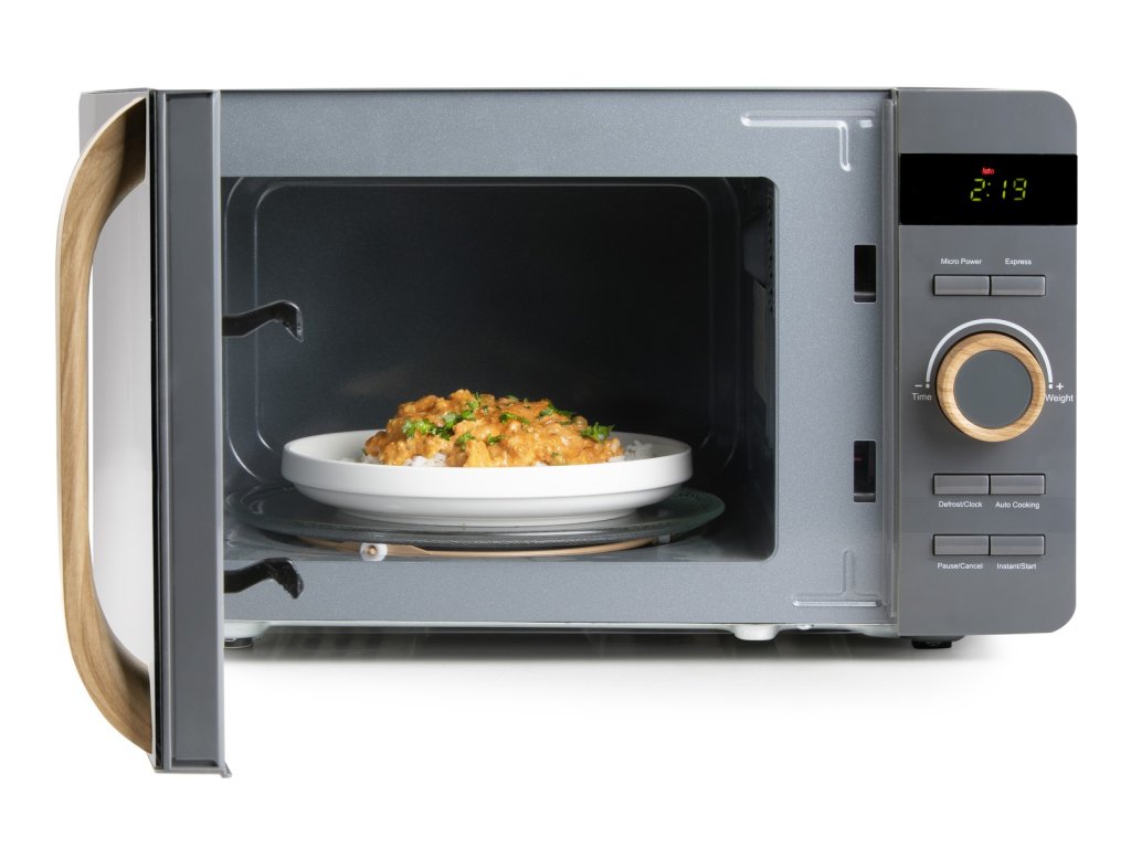 Funkce fázového ohřívání umožňuje nastavit dva příkony během jedné přípravy. Díky kompaktním rozměrům, zrcadlovým skleněným dvířkům a šedé povrchové úpravě se vzhledem dřeva je tato mikrovlnná trouba stylovou a praktickou volbou do vaší kuchyně.