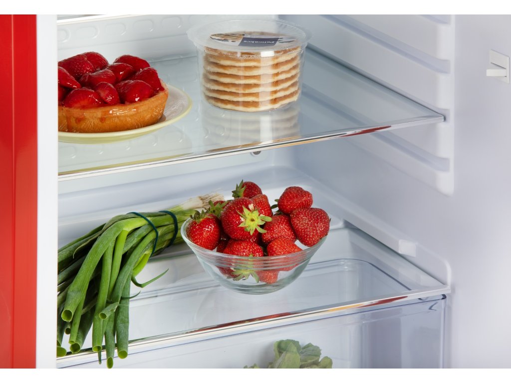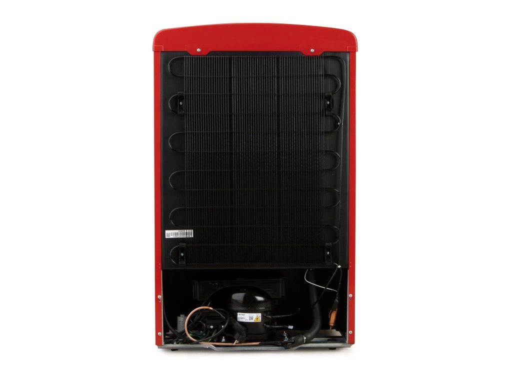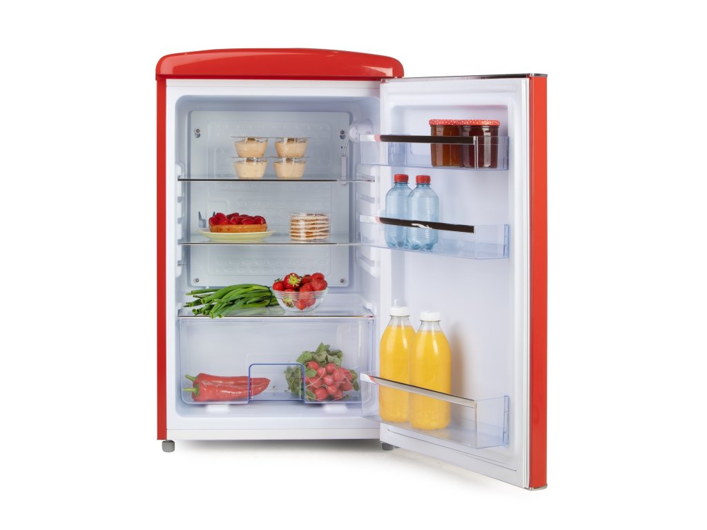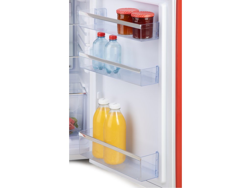Kompaktní retro lednice s vnitřním objemem 120 litrů v lesklé červené barvě perfektně zapadne do moderního interiéru vašeho bytu. Retro styl jse doplněn chromovaným madlem a chromovanou linkou na dveřích. Nízká erergetická náročnost se spotřřebou jen 71 kWh/rok.