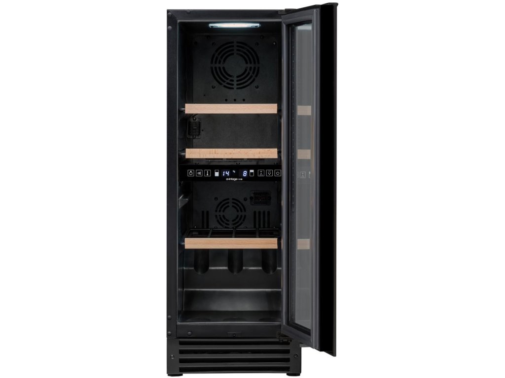 Dvouzónová servírovací vestavná vinotéka s kapacitou 25 lahví vína vhodná pod pracovní desku, horní zóna s kapacitou 16 lahví, spodní s kapacitou 9 lahví, kompresorové chlazení, rozsah nastavení teplot 5-12°C (horní zóna) a 12-20°C (spodní zóna), černá kovová skříň, černé skleněné dveře se 3 vrstvami šedě zabarveného skla s ochranou proti UV záření, možnost otočení závěsů dveří, 3 polovýsuvné kovové police s dřevěným čelem, Bílé LED světlo s vypínačem, Nová energetická třída G, zvukový i vizuální alarm vysoké teploty, 4 nastavitelné nožky (až 7 cm), antivibrační systém, nádobka s vodou pro udržování správné vlhkosti, Hlučnost 39 dB, Rozměry (š x h x v) : 29,5 x 57,4 x 81,7 cm
