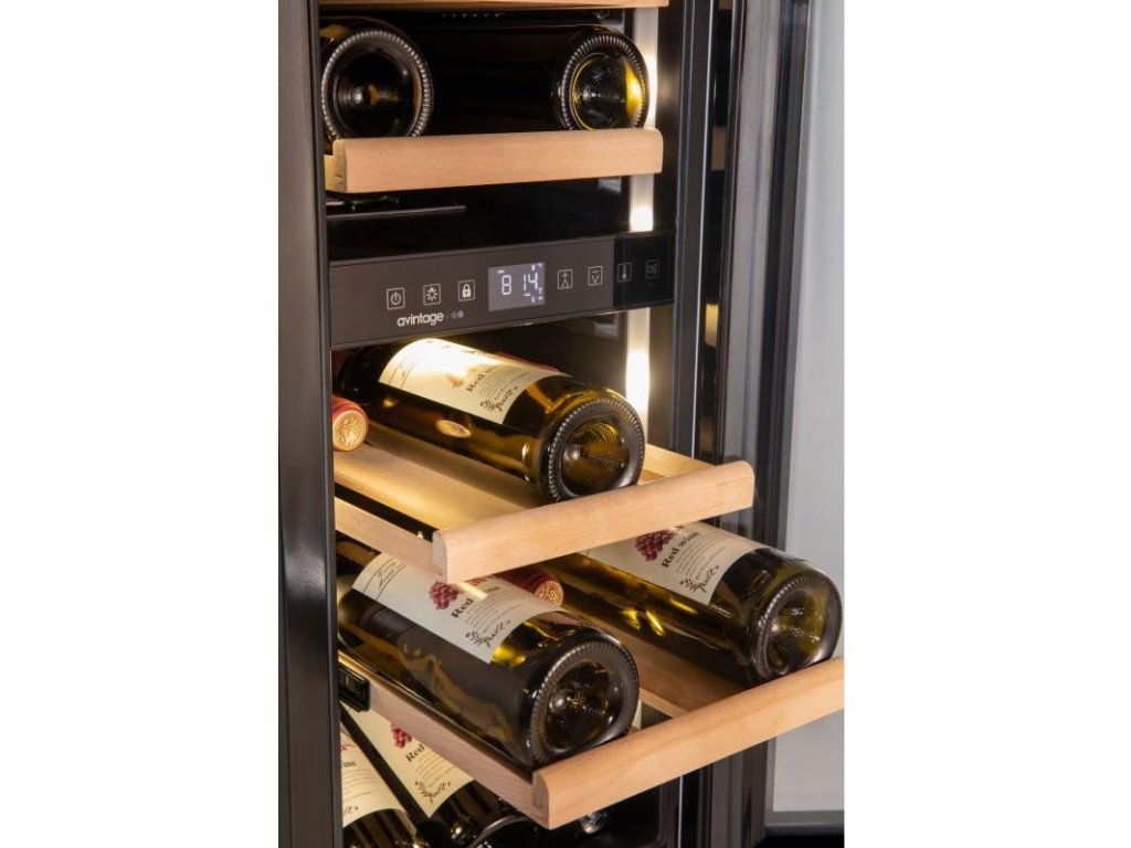 Vinotéka Avintage AVU31D88 je vybavena kompresorovým systémem chlazení, který zajišťuje rovnoměrné rozložení teploty v obou zónách. Antivibrační systém, přirozená regulace vlhkosti a filtr s aktivním uhlím chrání vaše vína před otřesy a nečistotami. K tomu navíc vizuální a akustické teplotní alarmy zajistí, že vaše vína budou vždy v bezpečí. Vinotéka je také kompatibilní s aplikací VINOTAG®, která vám umožní snadno spravovat vaši sbírku vín přímo z telefonu.