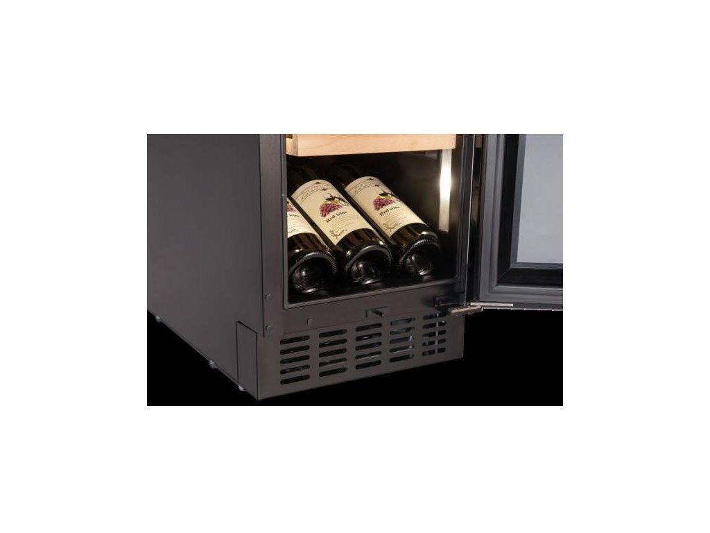 Díky černým skleněným dveřím s horizontálním madlem a třemi vrstvami šedě tónovaného skla je vaše víno nejen dokonale chráněno před škodlivými účinky UV záření, ale také prezentováno ve stylovém designu. Možnost otočení závěsů dveří umožňuje flexibilní instalaci a přizpůsobení vinotéky vašemu prostoru.