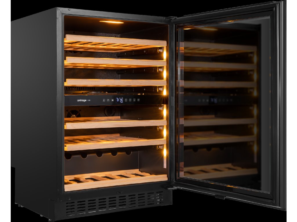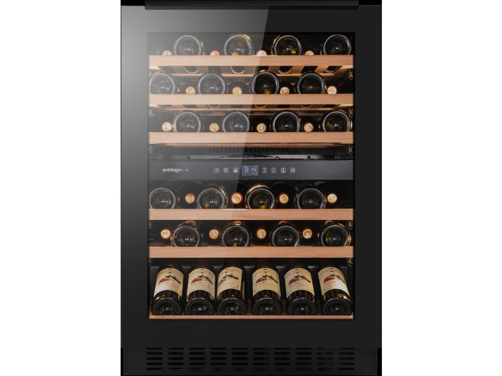 Dvouzónová servírovací vinotéka značky Avintage s možností instalace jako volně stojící nebo vestavná pod pracovní desku; Celková kapacita 46 lahví o objemu 75 cl, horní zóna 24 lahví, spodní zóna 22 lahví; Rozsah nastavení teplot: 5-12 °C pro horní zónu a 12-20 °C pro spodní zónu; Černý rám dveří s horizontálním madlem v horní části dveří; 3 vrstvy tvrzeného šedě tónovaného skla s nízkou emisivitou a s UV filtrem; Možnost změny směru otevírání dveří; Černé tělo vinotéky; Možnost demontáže spodní ventilační mřížky a jejího nahrazení (perforovaným) nábytkovým soklem; Sokl s výřezem 2 cm a odnímatelná větrací mřížka, celkem 7,5 cm; Výklenek v zadní části, Bílé podsvětlený displej; LED osvětlení s vypínačem a s možností nastavení barvy a intenzity osvětlení podle potřeby aby odpovídalo atmosféře vaší kuchyně; Vyberte si ze 3 barev: studená bílá, teplá bílá, jantarová a 4 stupňů intenzity: 25%, 50%, 75%, 100%; 5 ks výsuvných dřevěných polic; 1 ks pevná prezentační dřevěná police; Police na teleskopických výsuvech; Elektronická regulace teploty; Automatické odmrazování; Přirozená regulace vlhkosti; Systém aktivní ventilace v obou zónách; Antivibrační systém; Vizuální a zvukové alarmy pro zvýšení teploty a otevřené dveře; Filtr s aktivním uhlím; Alarm opotřebení filtru s aktivním uhlím; Klimatická třída ST (16°C - 38°C); 4 výškově nastavitelné nožky až 9,5 cm; Délka napájecího kabelu 180 cm; Energetická třída F; Roční spotřeba energie 102 kWh; Hlučnost 37 dB; Hmotnost 56 kg; Rozměry (VxŠxH): 88 x 59,5 x 57,5 cm