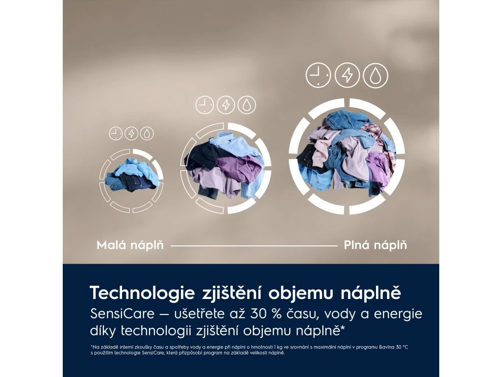 Senzoricky přizpůsobuje délku programu, množství vody i energie podle náplně, takže oblečení nezůstává zbytečně dlouho v bubnu.