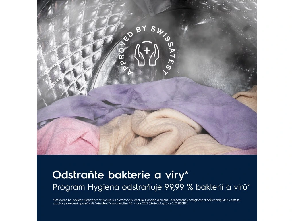 Kombinuje prací cyklus s párou a podle výrobce pomáhá odstranit více než 99,99 % bakterií a virů a současně redukovat pyl a alergeny.