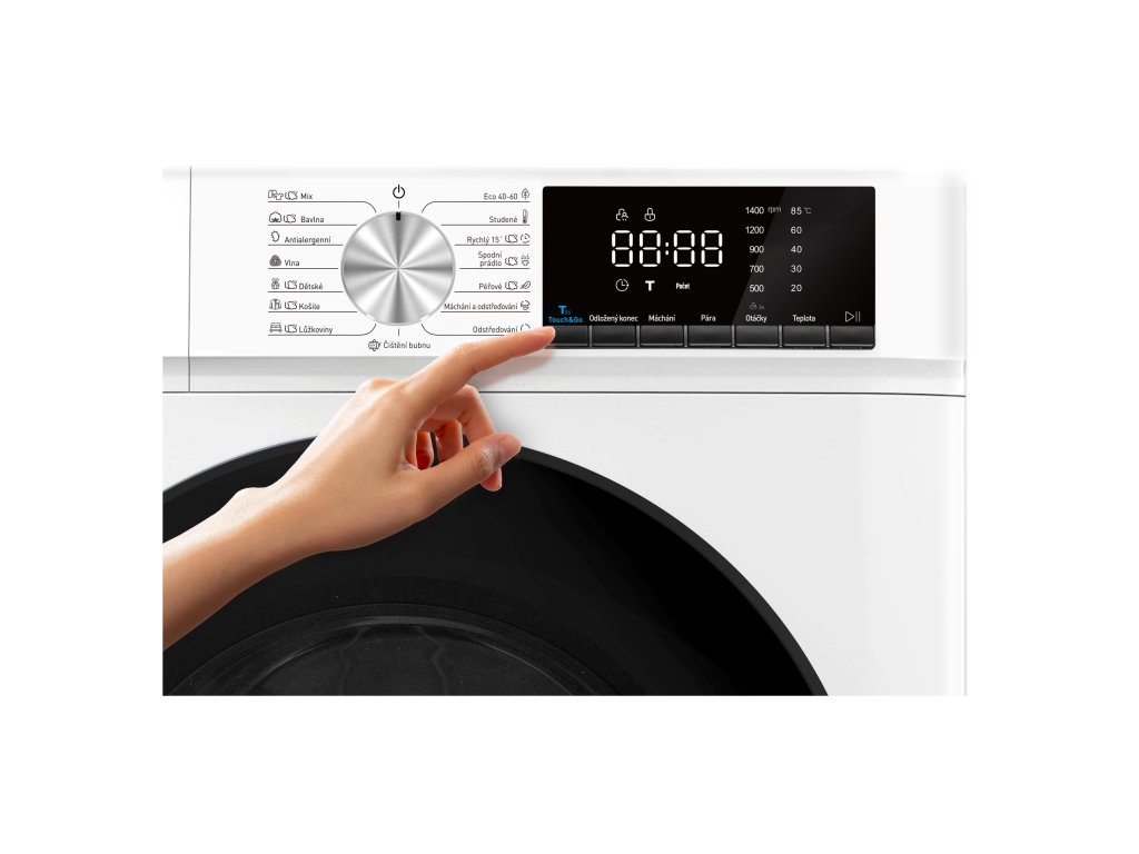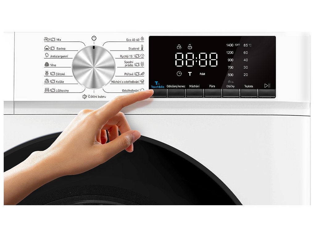 Praktická funkce Touch & Go umožní zahájit praní jediným stiskem – pračka sama zváží náplň a přizpůsobí prací cyklus. Nechybí parní program pro vyšší hygienu ani rychlé programy 15 minut nebo 1 hodina.