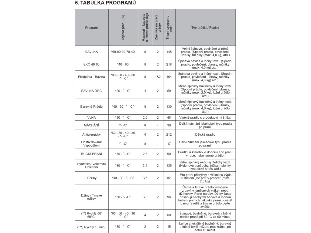 - 15 pracích programů: Rychlý 15', Rychlý 60', Eco 40-60°C aj.