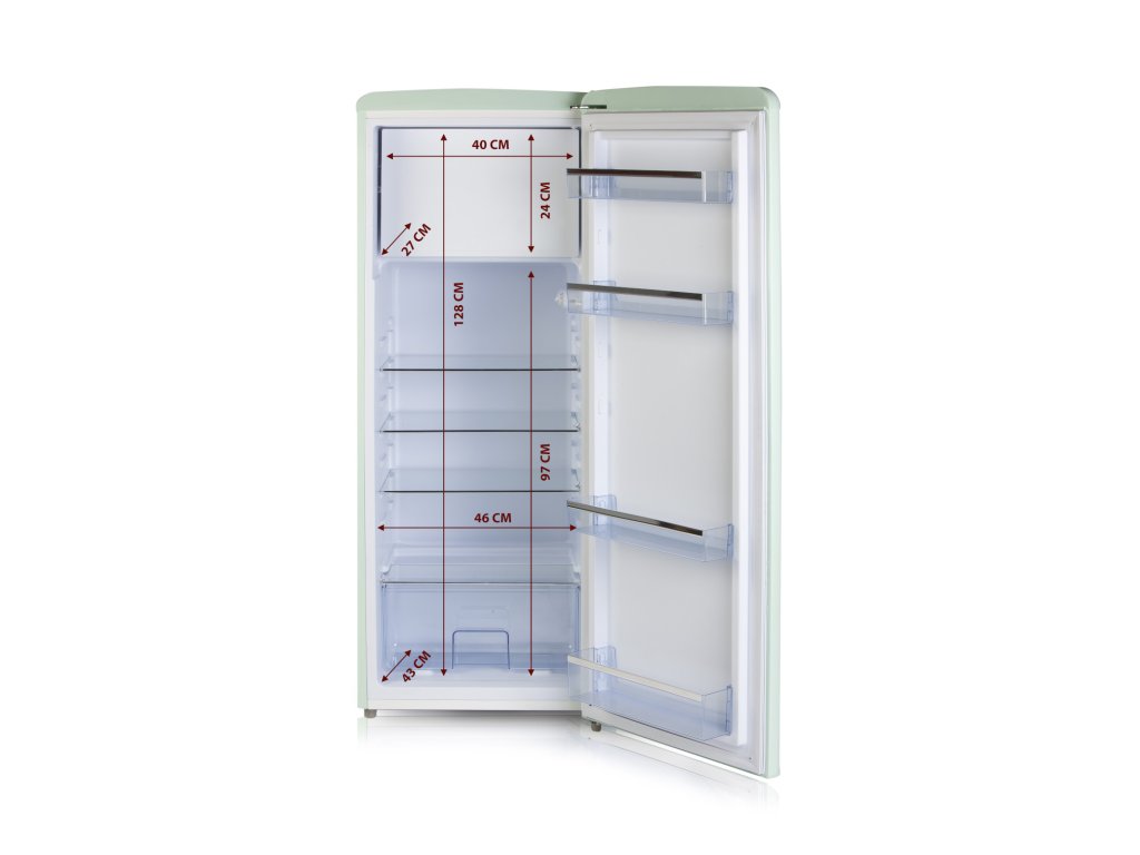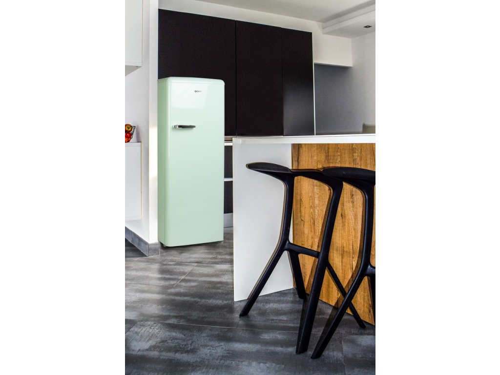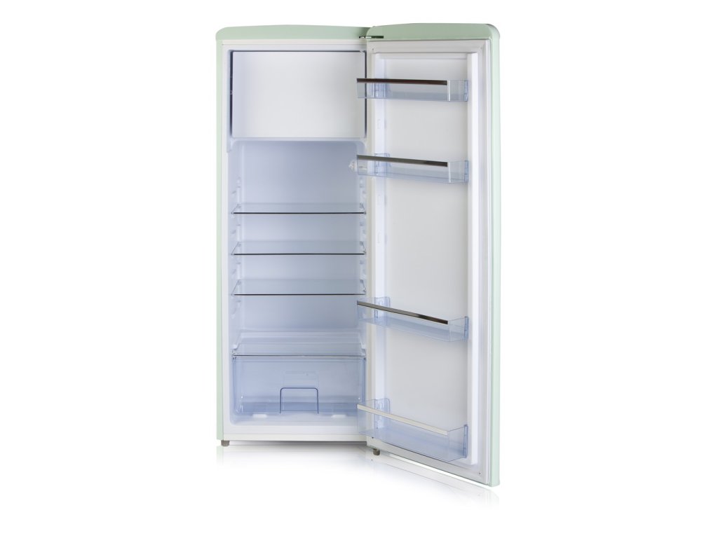 Velmi úsporná lednice v oblém retro designu ve světlé mátově zelené barvě vám přinese novou svěžest do vaší kuchyně. Velký chladící prostor na čerstvé potraviny doplňuje vnitřní vestavěný mrazáček o objemu 24 l.