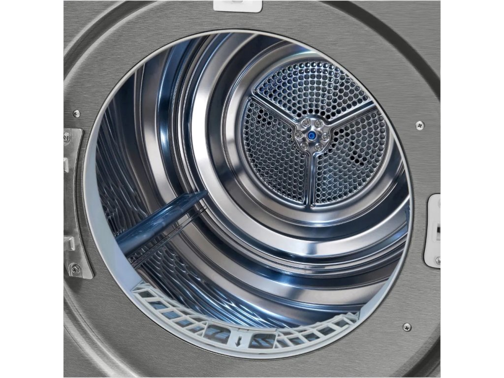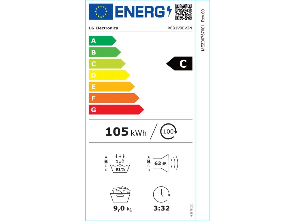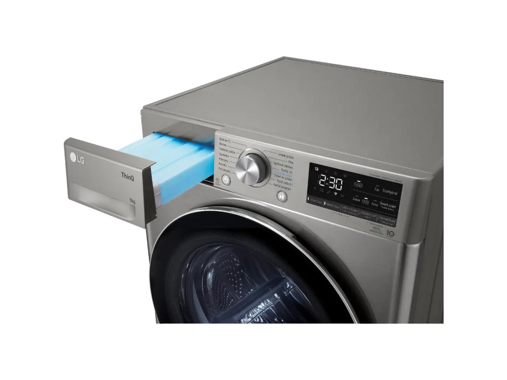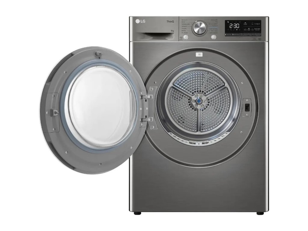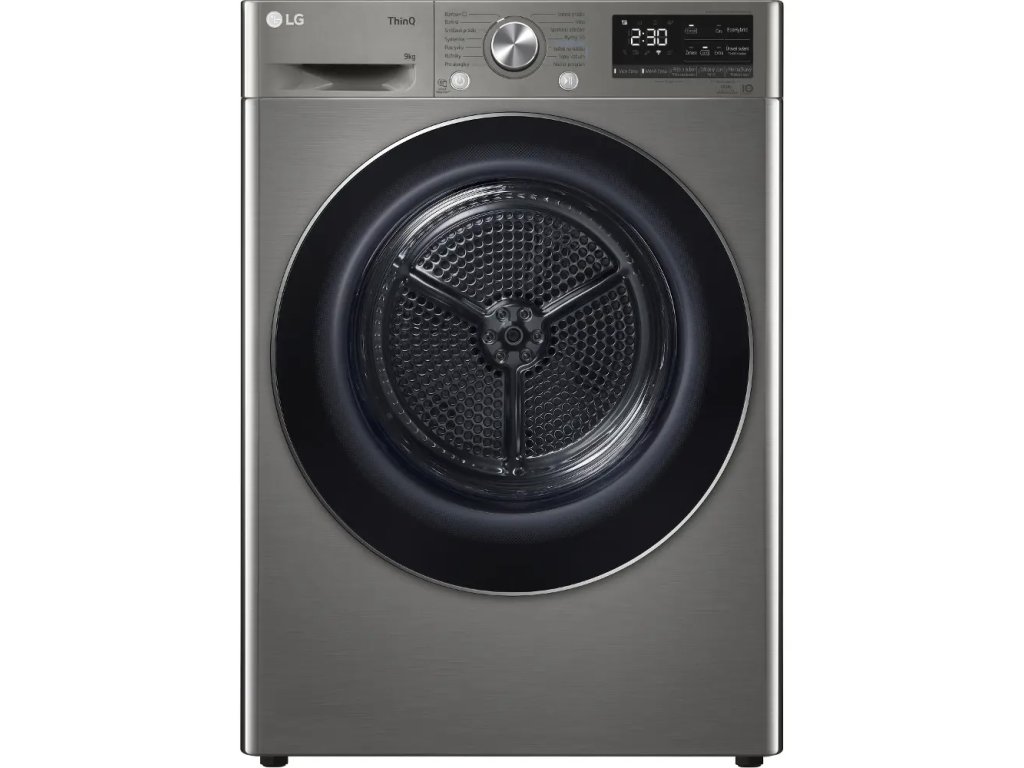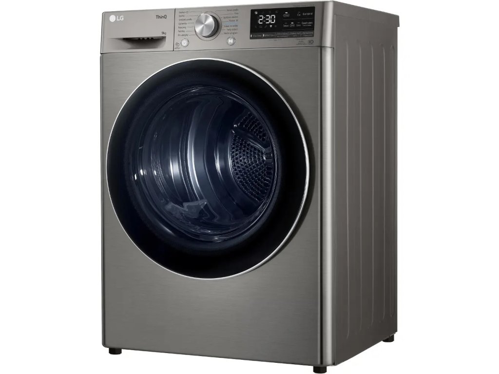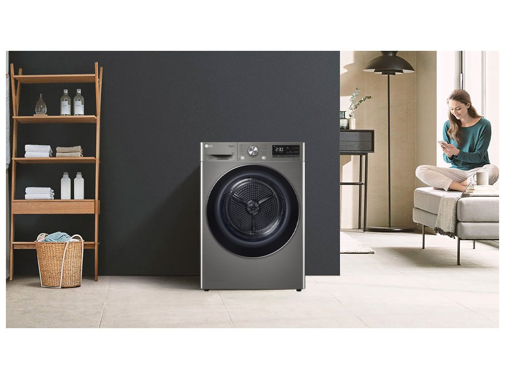 Sušička s kapacitou 9 kg, energetickou třídou C, hlučností 62 dB a konektivitou Wi-Fi v aplikaci LG ThinQ. Nechybí invertorový motor, duální invertorový kompresor a automatické čištění kondenzátoru.