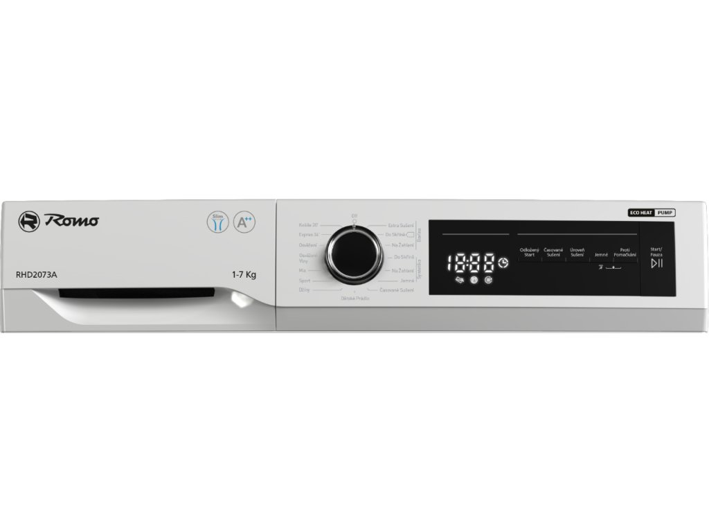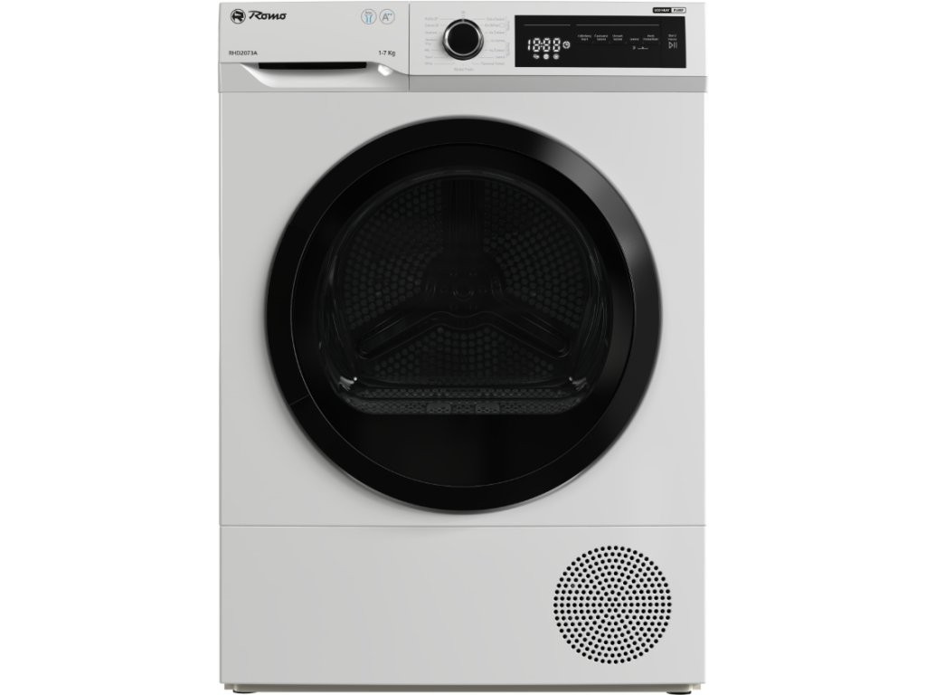 Představujeme sušičku prádla Romo RHD2073A s tepelným čerpadlem, která nabízí kapacitu až 7 kg prádla a energetickou třídu E. Tato sušička v bílém provedení s černým ovládacím panelem poskytuje intuitivní ovládání s otočným voličem, tlačítky a LED displejem. Perlový buben šetrný k prádlu a vnitřní LED osvětlení zajišťují optimální péči o vaše oděvy.