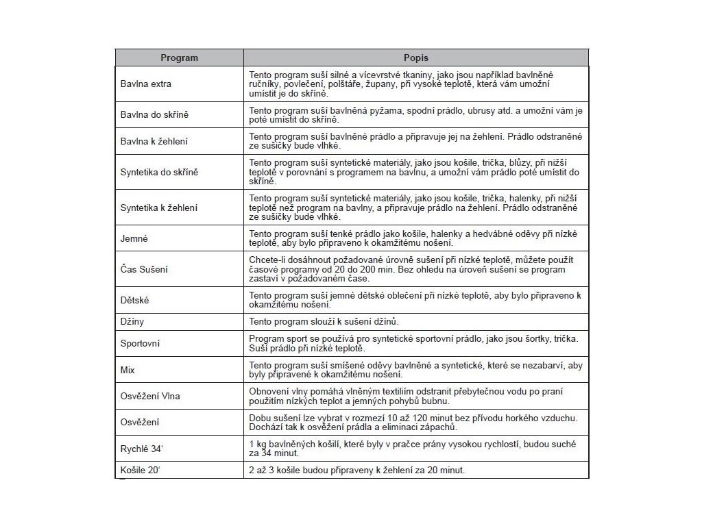 Programy sušení: | Jemné, Dětské, Džíny, Bavlna na žehlení, Syntetika na žehlení, Osvěžení vlny, Osvěžení, Sport, Bavlna extra sušení, Bavlna do skříně, Syntetika do skříně, Časované sušení, Mix, 34 min., Košile 20' |