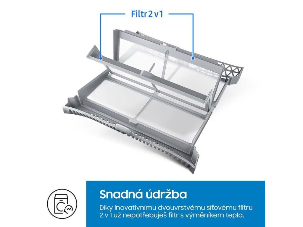 Spolehněte se na vyšší bezpečnost a maximálně optimalizovaný výkon sušičky Samsung DV80CGC0B0AELE s inovativním filtrem 2 v 1, který disponuje dvouvrstvým síťovým uložením bez nutnosti přítomnosti výměníku tepla, což zásadním způsobem usnadňuje údržbu zařízení. Vy tak nejen, že ušetříte čas a energii v rámci péče o svůj spotřebič, ale rovněž se dozvíte, kdy bude třeba čištění opětovně provést díky dvěma zabudovaným chytrým alarmům.