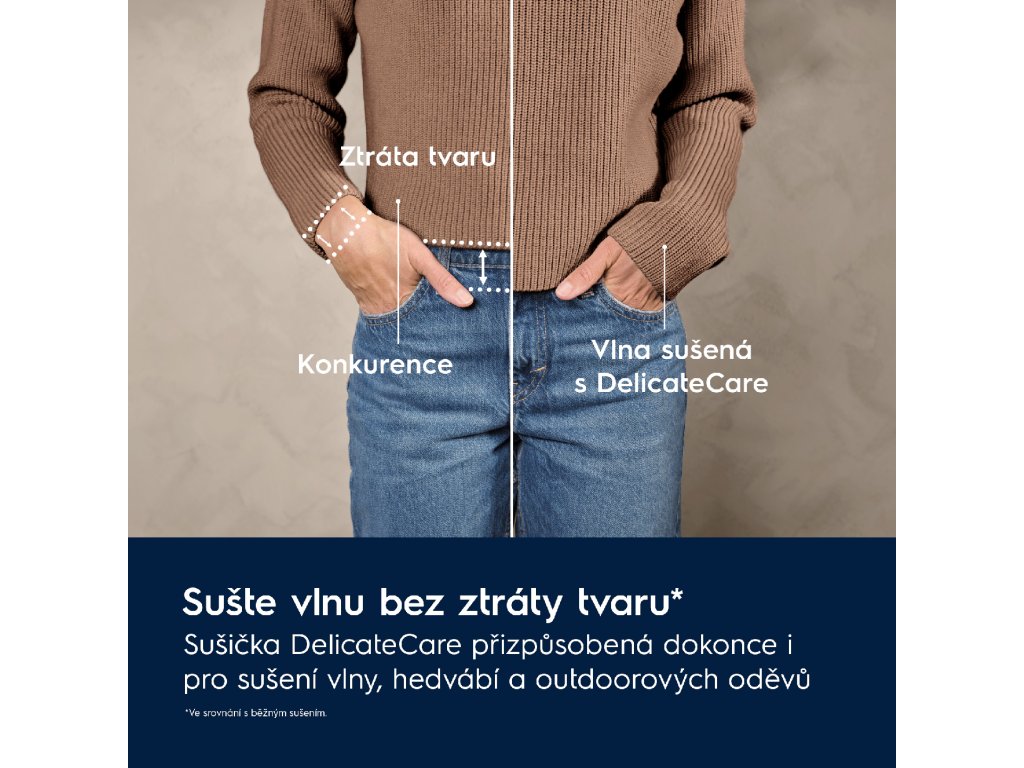 DelicateCare upraví teplotu a pohyb bubnu podle vloženého oblečení. Hedvábí si uchovává tvar, vlna se bezpečně usuší bez sražení a funkční oblečení si zachová voděodolnost. Certifikace Woolmark.