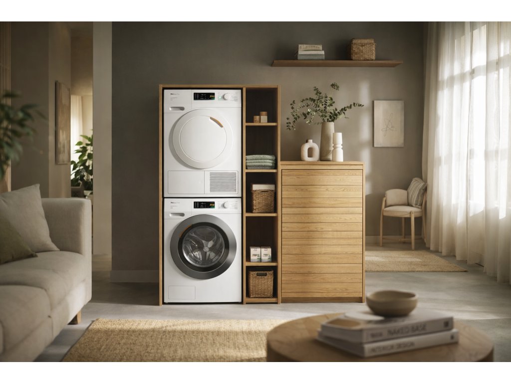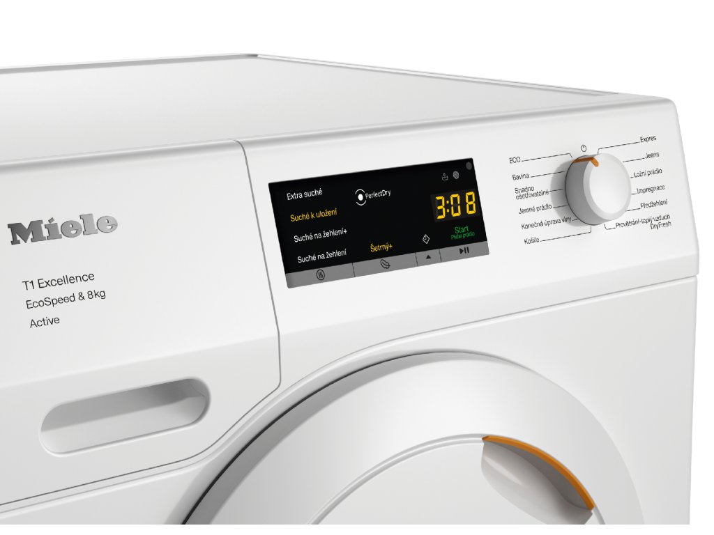 Řada T1 s kapacitou 8 kg, ovládáním EasyControl a funkcemi EcoSpeed, EcoDry a FragranceDos. Tepelné čerpadlo zajišťuje šetrné sušení s nižší spotřebou.