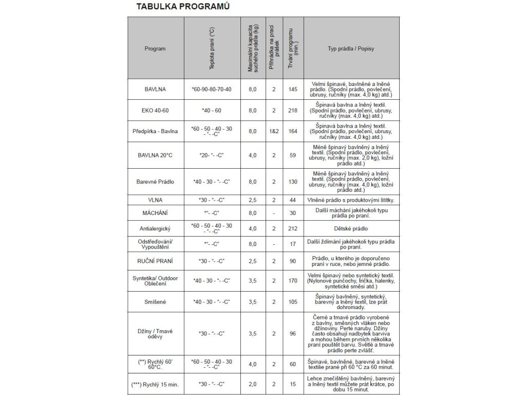 | Programy praní: | Rychlý 15 min., Džíny / Tmavé oděvy, Rychlý 60', Mix, Bavlna, Bavlna s předpírkou, Vlna, Ruční praní, Máchání, Bavlna 20°, Odstředění + vypouštění, Antialergický, Barevné prádlo, Eco 40-60, Outdoor |