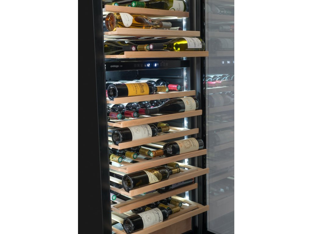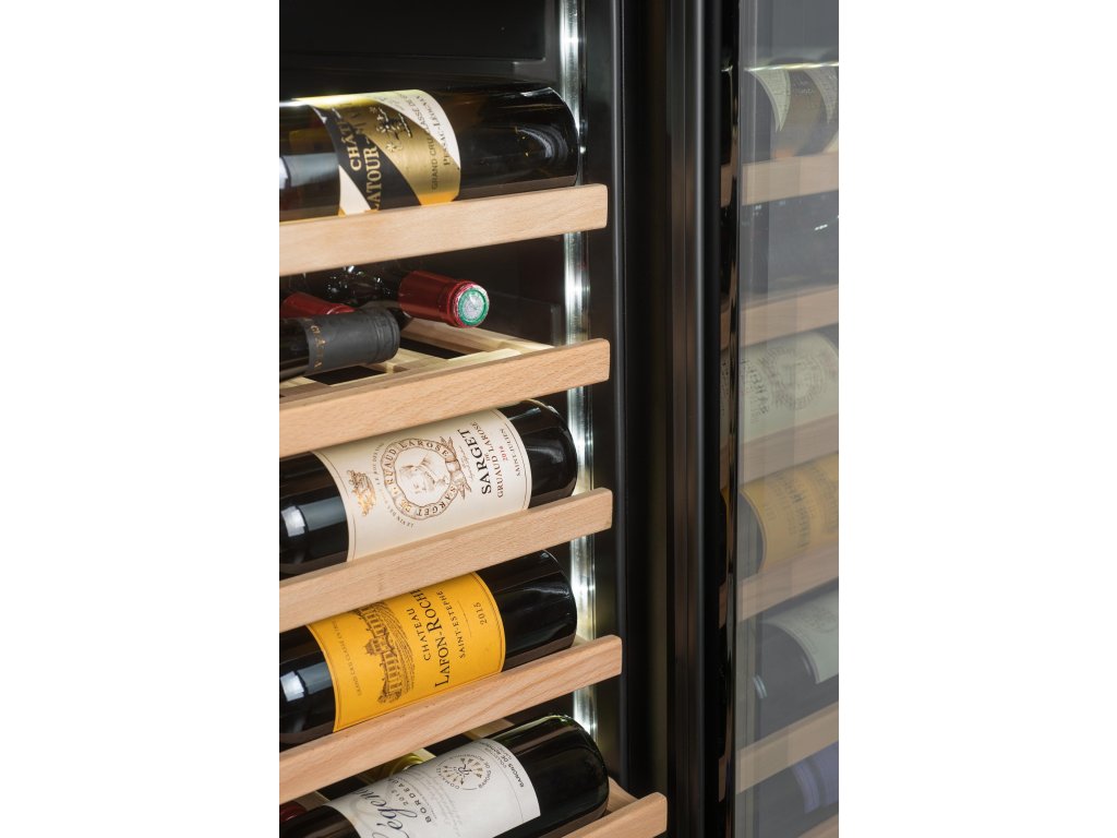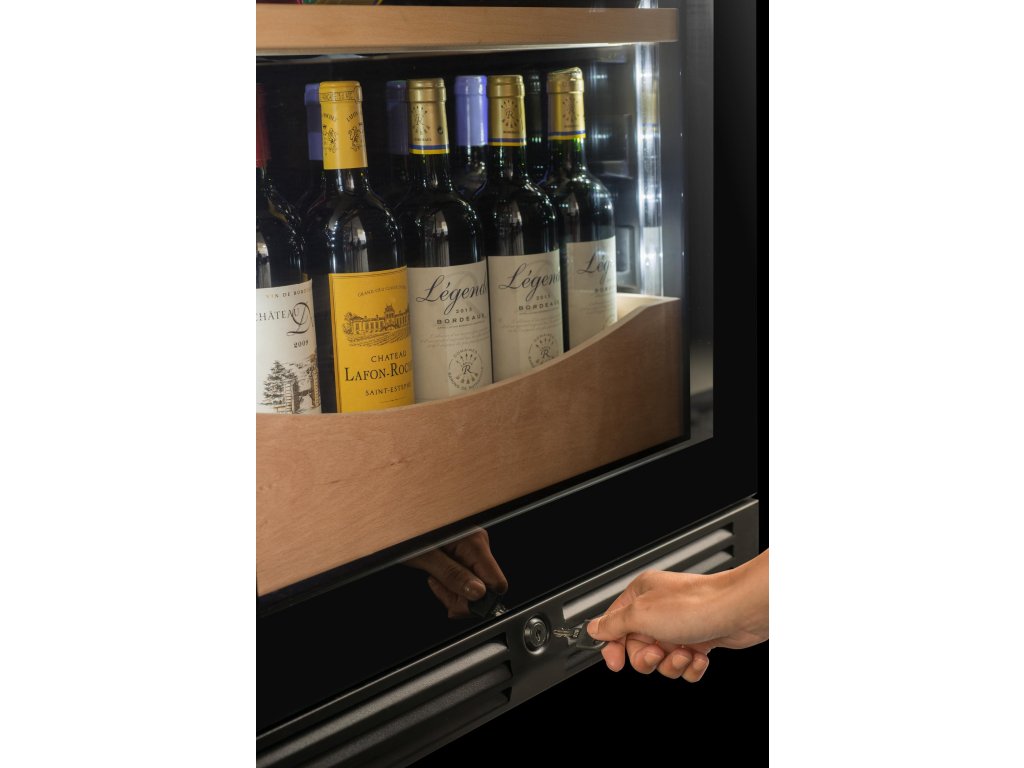 Prosklené dveře vinotéky jsou vybaveny trojitým zasklením se šedým tónováním a UV filtrem, který chrání vína před světlem. Vertikální madlo zajišťuje pohodlné otevírání, a díky možnosti změny směru otevírání dveří se vinotéka snadno přizpůsobí každému prostoru. Bílé LED osvětlení elegantně podsvěcuje sbírku a 14 výsuvných bukových polic umožňuje snadný přístup k lahvím.