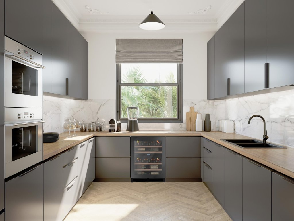 Vinotéka je vybavena prosklenými dveřmi s trojitým zasklením z šedě tónovaného tvrzeného skla, které chrání vína před škodlivým UV zářením. Dveře jsou opatřeny systémem Push-Pull a pantografickými závěsy pro snadné a plynulé otevírání. Černé tělo vinotéky a možnost nahrazení spodní ventilační mřížky nábytkovým soklem dodávají elegantní a flexibilní vzhled pro každý interiér.