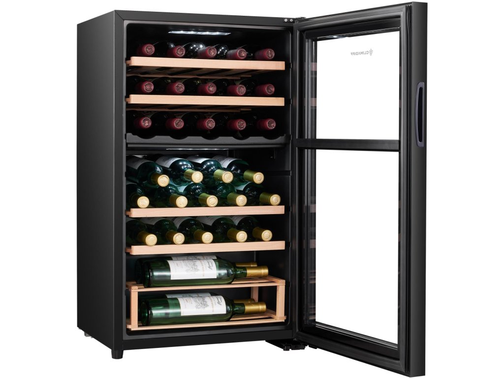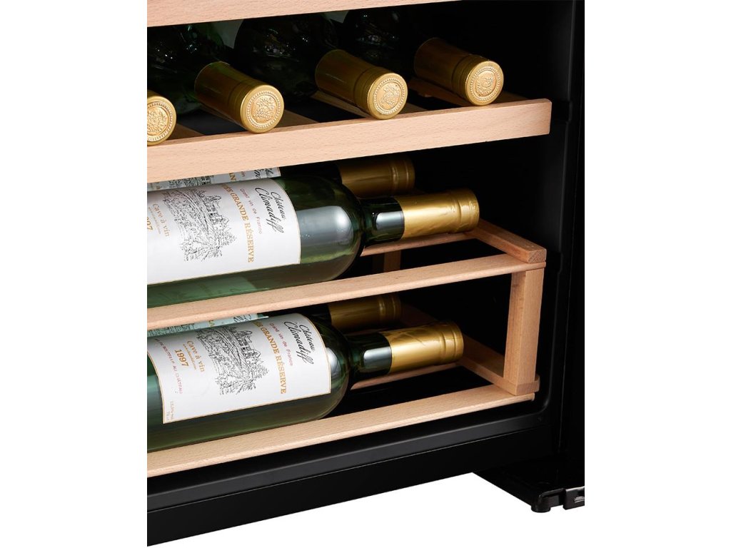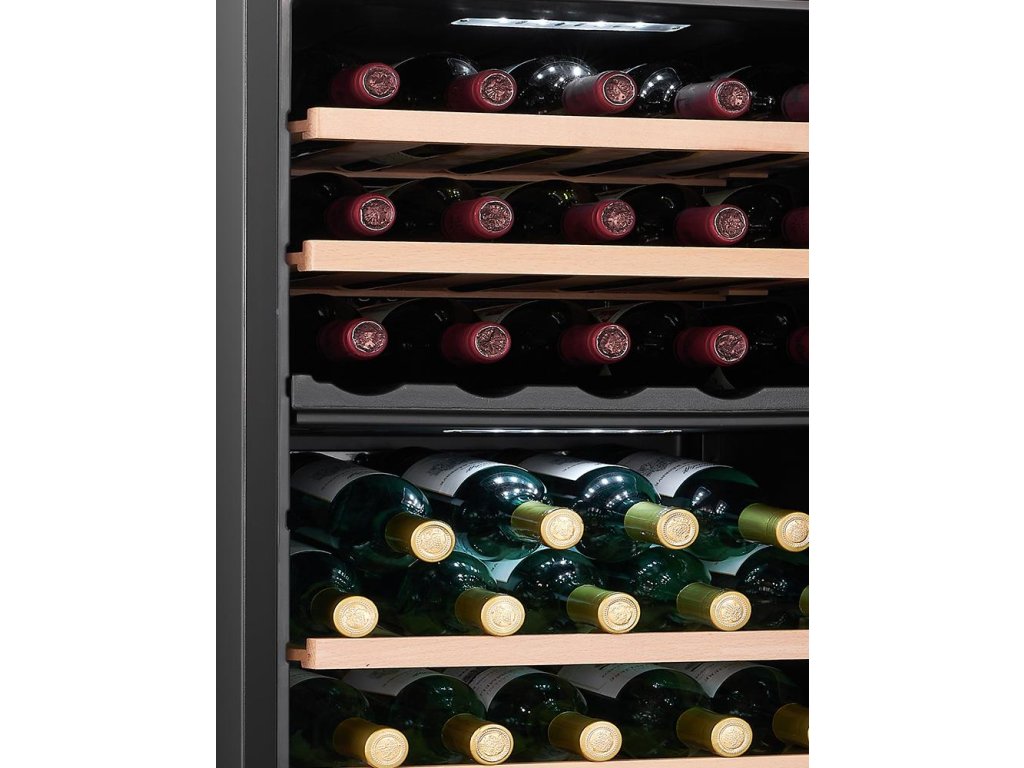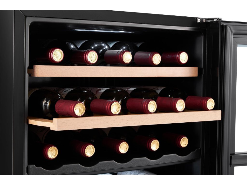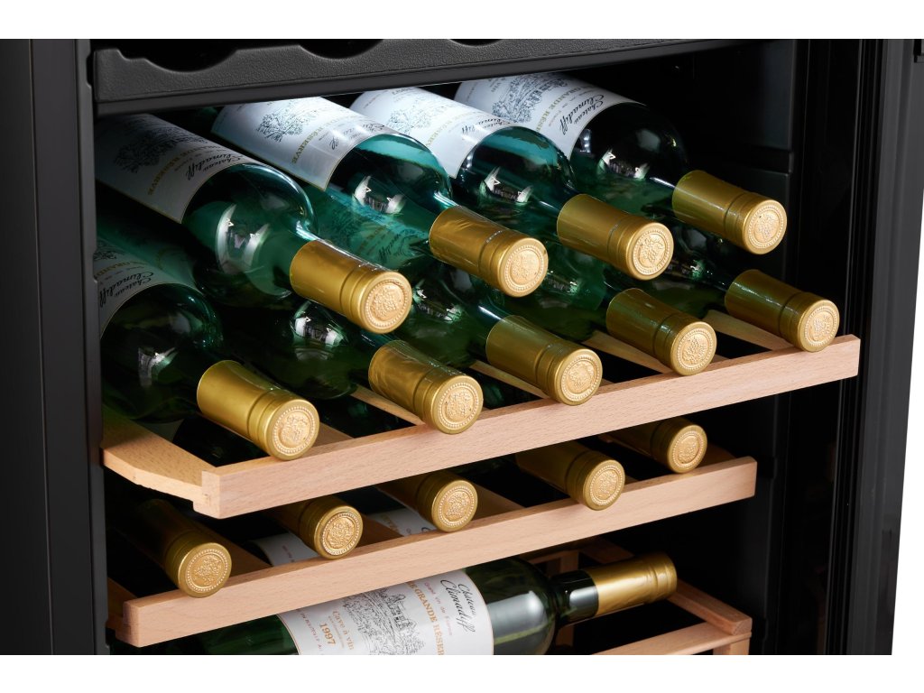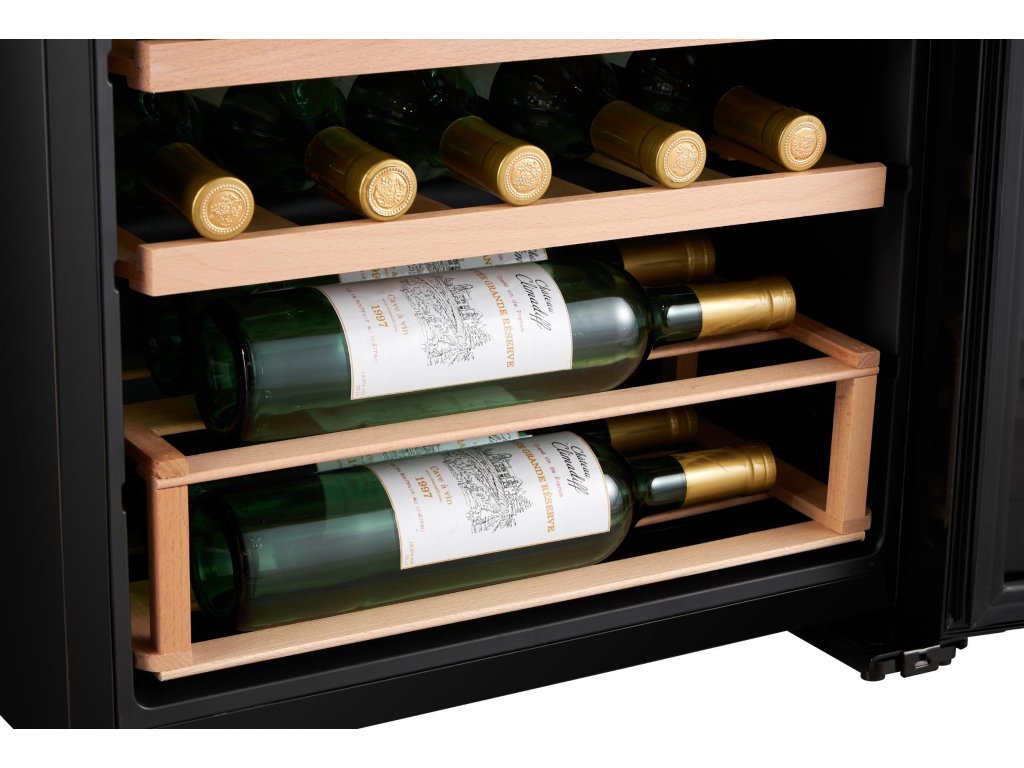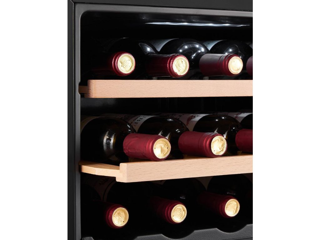 Volně stojící dvouzónová servírovací vinotéka se 2 nezávislými chladícími zónami; Celková kapacita 33 lahví o objemu 75 cl (horní zóna 15 lahví, spodní zóna 18 lahví); Rozsah nastavení teplot: 5~20 °C pro horní zónu a 5~20 °C pro spodní zónu; Skleněné dveře s černým rámem a zapuštěným madlem; 2 vrstvy tvrzeného skla s černým tónováním a UV filtrem; Černé tělo vinotéky; Elektronická regulace teploty; Dotykové ovládání s LED displejem v bílé barvě; Bílé LED osvětlení s vypínačem; Automatické odmrazování; Systém aktivní ventilace v obou zónách; Antivibrační systém; Zvukový a vizuální signál zvýšení teploty; 4 dřevěné police; 4 výškově nastavitelné nožičky; Délka napájecího kabelu 200 cm; Energetická třída G; Klimatická třída N; Roční spotřeba energie: 136 kWh; Hlučnost 36 dB(A); Hmotnost 26 kg; Rozměry (VxŠxH): 84,8 x 49,5 x 43 cm.