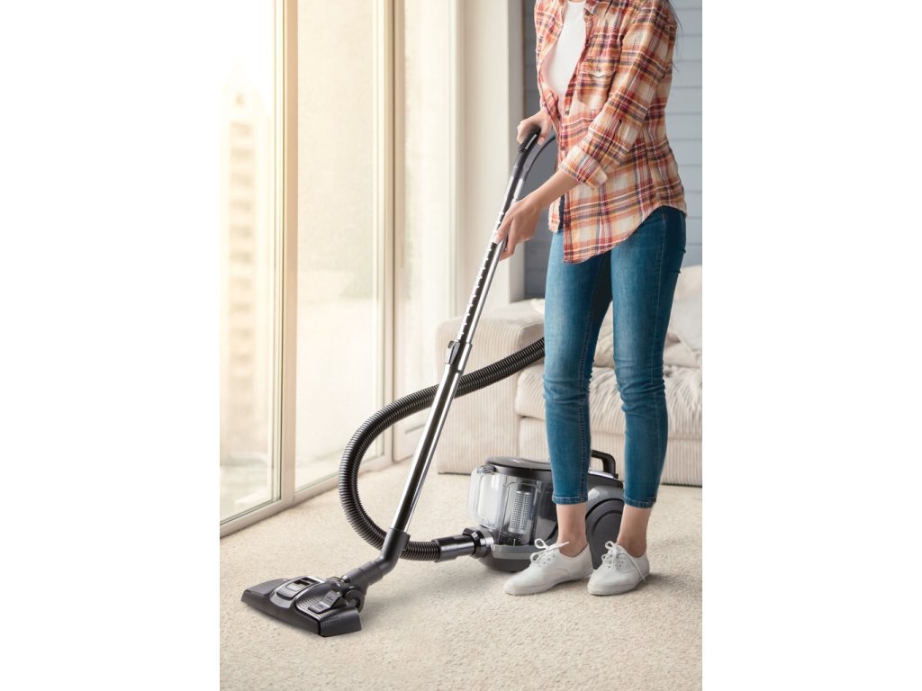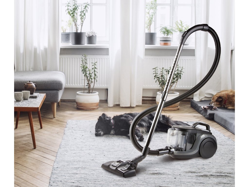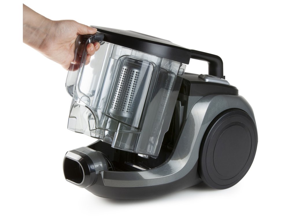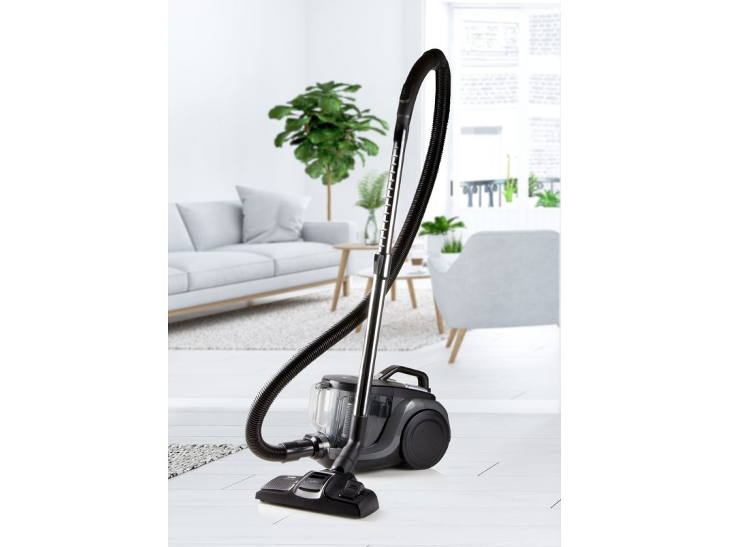 Vysoce výkonný bezsáčkový vysavač s cyklónovým systémem filtrace. Cyklónová filtrace efektivně odstředí veškeré hrubé nečistoty a umožňuje udržovat oproti běžným sáčkovým vysavačům vysoký výkon sání i při plnější prachové nádobě. Nádoba pojme až 2,5 l nečistot a lze ji z vysavače jednoduše vyjmout, vysypat a případě umýt. O jemnější filtraci nasátého vzduchu se pak stará kaskáda filtrů v podobě omyvatelného prachového filtru s pěnovou strukturou, speciální bavlněný filtr chránící motor před jemným prachem, pachový uhlíkový filtr a nakonec HEPA filtr s účinností zachycení nejmenších částeček a mikroorganismů až 99,9%. Kombinací dlouhého přívodního kabelu, teleskopické kovové trubky a sací hadice lze pohodlně vysávat až 8 m od elektrické zásuvky.