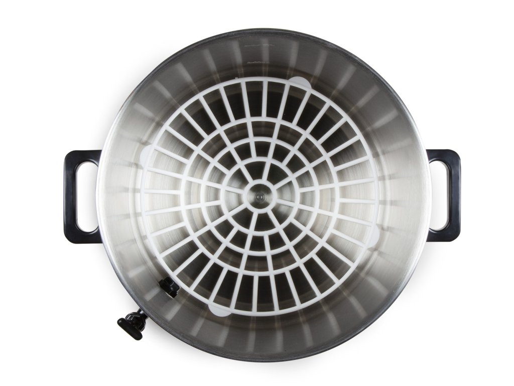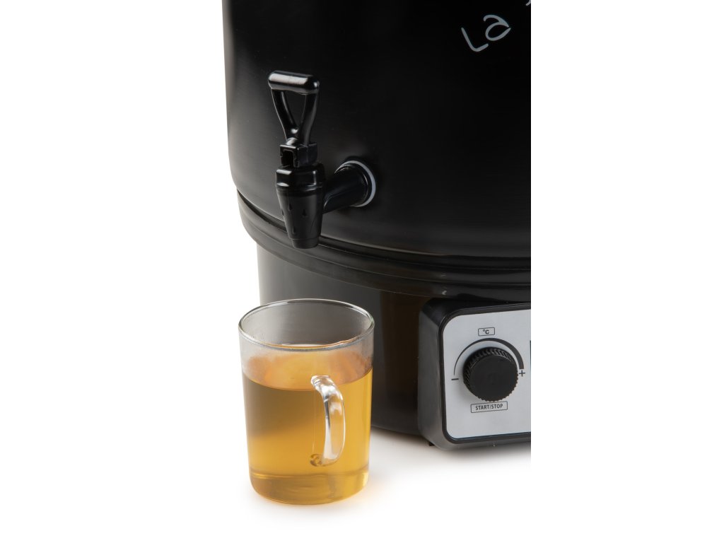 Provedení z vysoce kvalitního nerezu se dvěma otvory pro výpustné kohouty a funkce nepřetržitého ohřevu pak předurčují tento model hrnce i pro využití na výdej teplých nápojů.